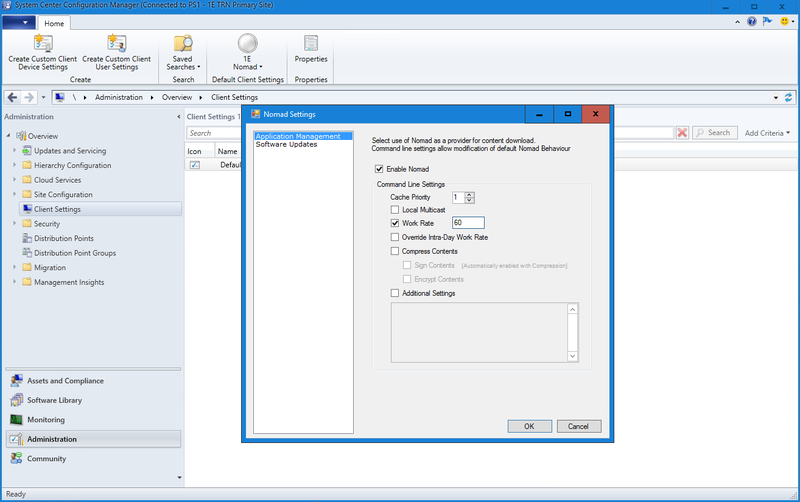 For Applications and Software Updates, Nomad is enabled on each client for all Applications and Software Updates through Default Client Settings. When the CM client requires Nomad-enabled content, it passes a request to Nomad, which in turn downloads the content, places it in the CM client cache and passes back to the CM client for execution. The 1E Client (with Nomad client module enabled) must be installed on all CM client machines and on all Distribution Points (DP).