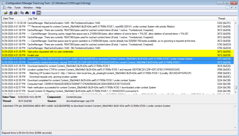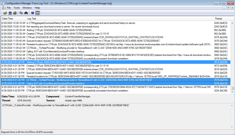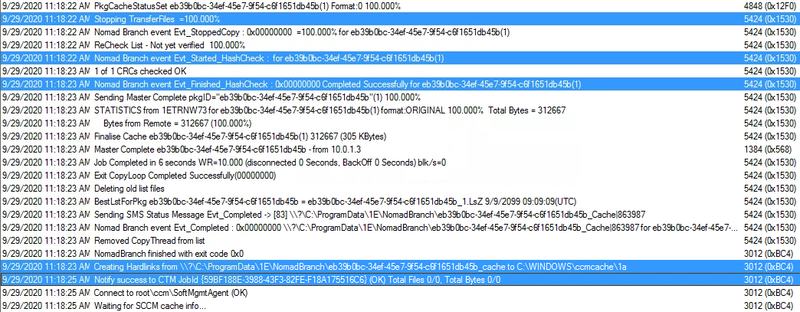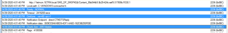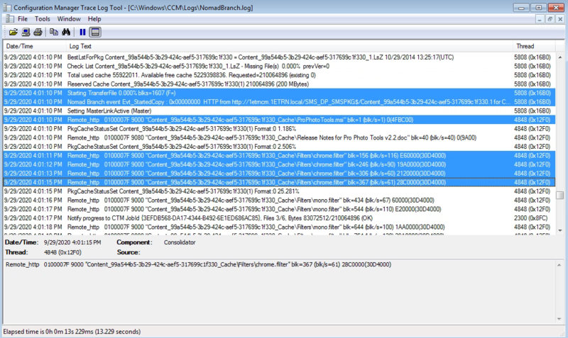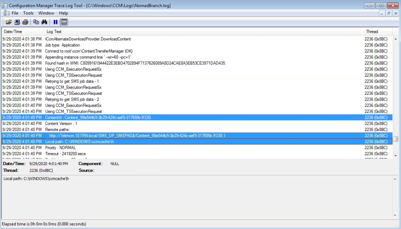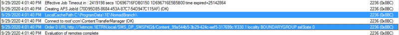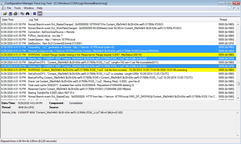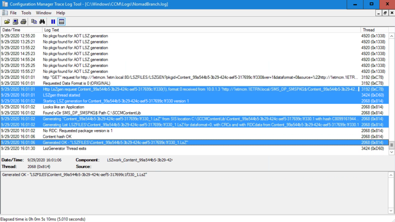 We switch to our Configuration Manager Server and open c:\Windows\CCM\Logs\NomadBranch.log where we can identify the point where the agent on the DP intercepts the request and generates the LsZ file.