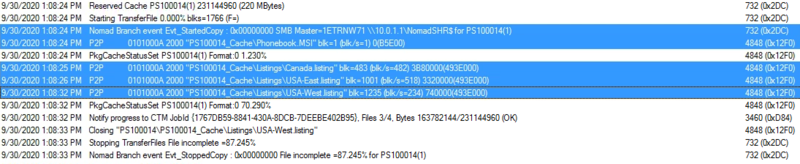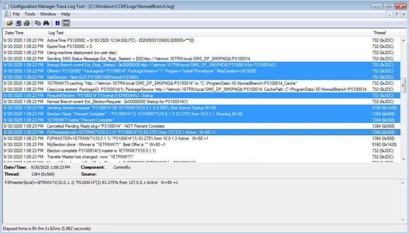 On 1ETRNW73 Using CMTrace.exe we open the NomadBranch.log from C:\Windows\CCM\Logs and Identify the election for the Phonebook Package which has a content ID of PS100014.