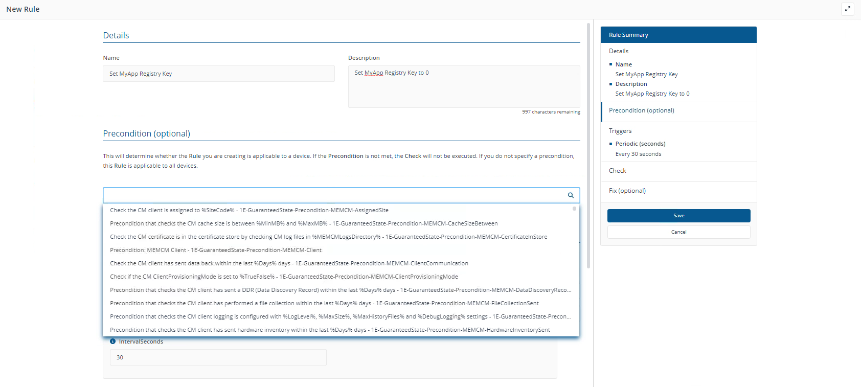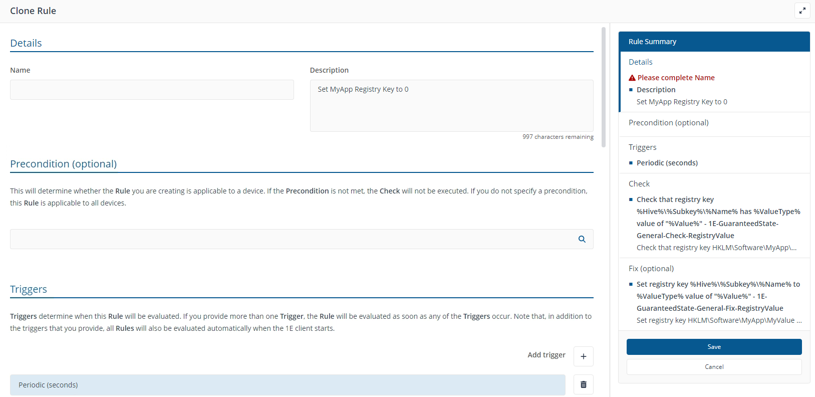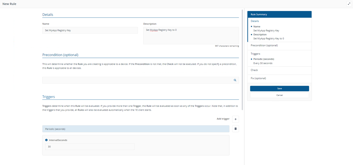 Do not specify a period less than 30 seconds. The rule may be accepted by the management interface but the 1E Client will not apply it.