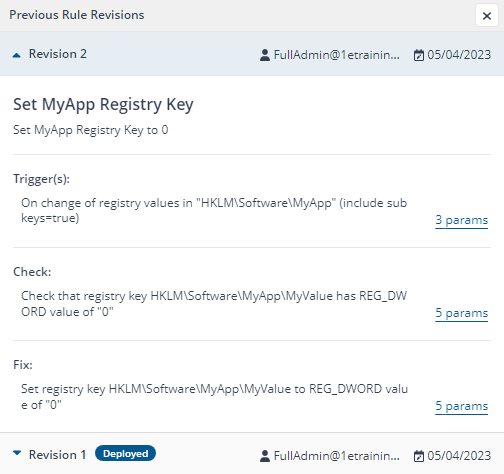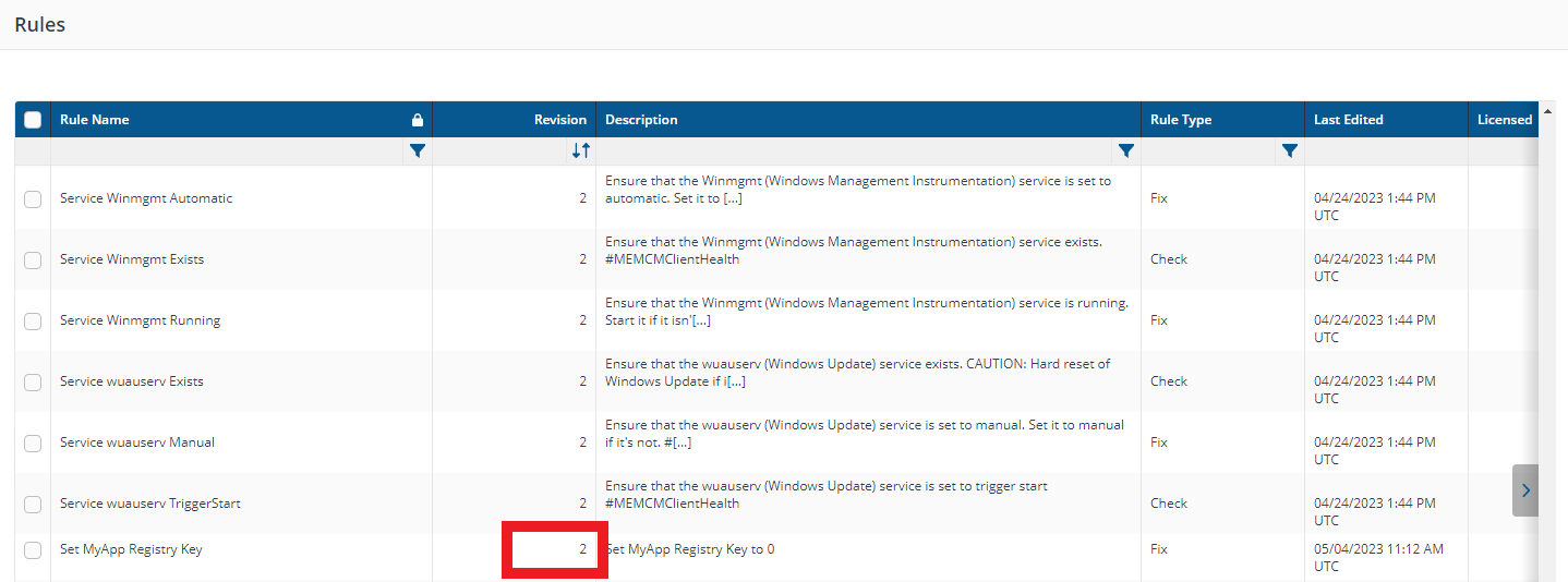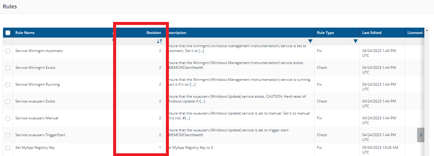 When a rule is edited a Revision history is created, this is visible in the Revision column of the Rules screen.
