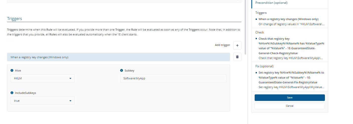 Clicking the Edit button then opens the Rule for editing, in this example, the trigger was changed from Periodic (seconds) to be when a Registry entry changes. Selecting this trigger added additional fields to be populated which were, the Hive, Subkey and whether to include Subkeys