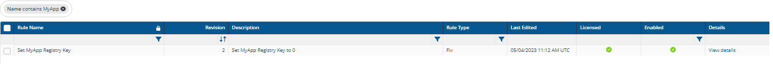 You can view the rule details for a rule by clicking the View Details link displayed on the rules page under the Details column, showing: