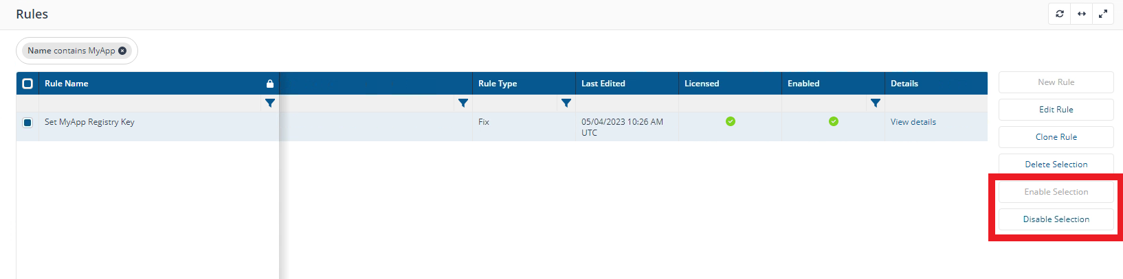 You can enable and disable rules by selecting the rule with the checkbox on the left and then selecting Disable Selection, if the rule is enabled, or Enable Selection, if the rule is disabled.