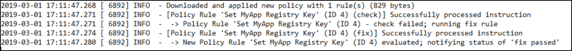 You can confirm a policy was downloaded and applied with the 1E Client by examining the 1E Client log on the device.