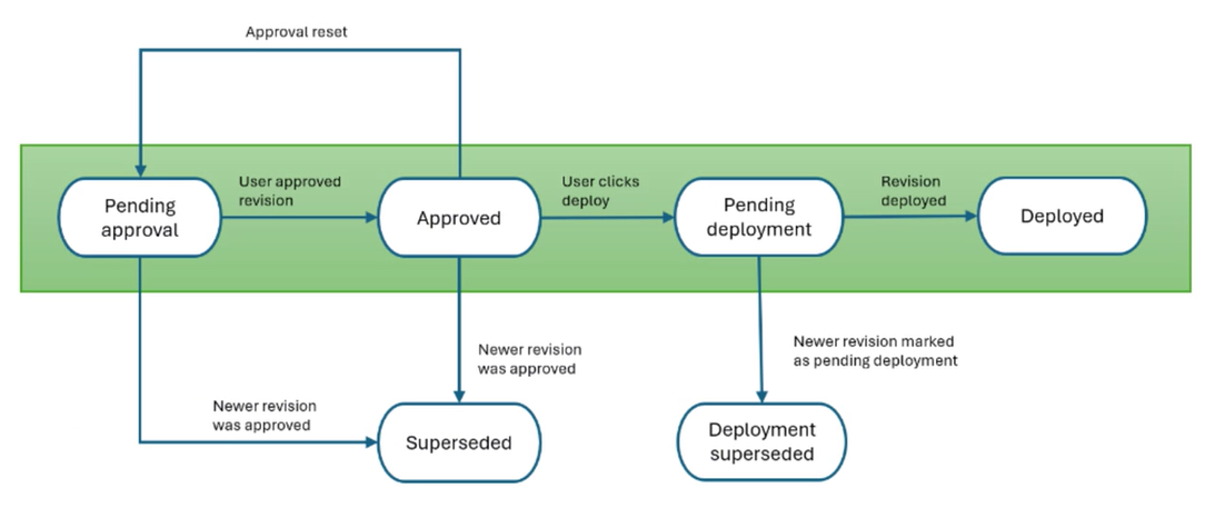You can reject an approved revision, which reverts the revision state to Pending. However, the Superseded and Deployed or committed revision statuses cannot be reverted to Pending: