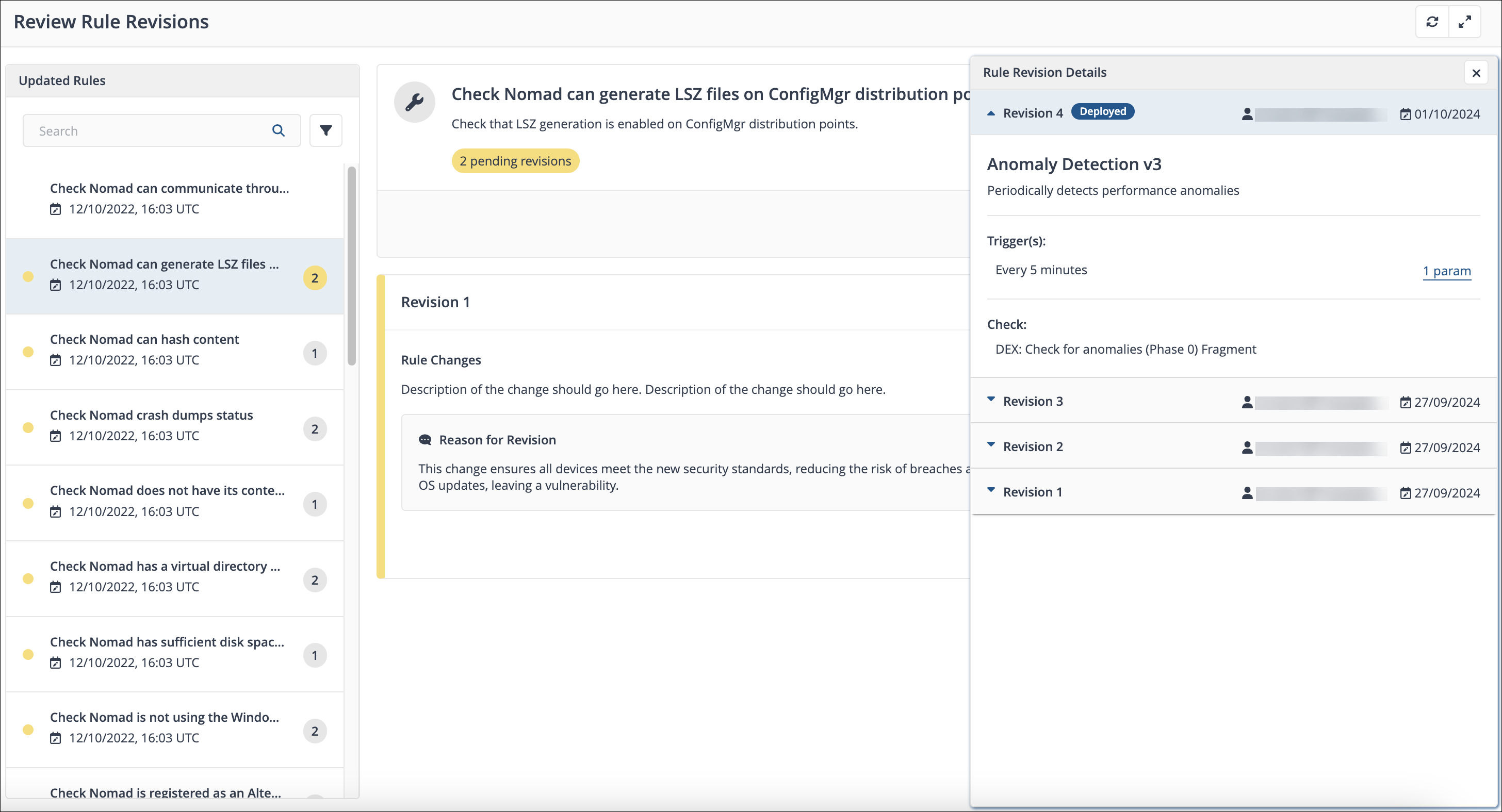 When you create, edit, enable, or disable a rule, a new revision is created, and that rule cannot be deployed if that revision is not approved. To approve revisions, a platform user must have one of Guaranteed State Administrator, Guaranteed State Approver, or Full Administrator role to approve rule changes. Refer to Configuring Endpoint Automation, and Roles and Securables
