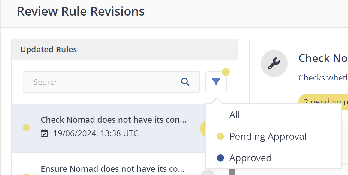 Clicking Review Changes at the top of the Rules page displays recently created rule revisions for approval on the Review Rule Revisions page. You can filter the results in the Updated Rules section, by Approved and Pending, or searching through the list of rules to refine the results.