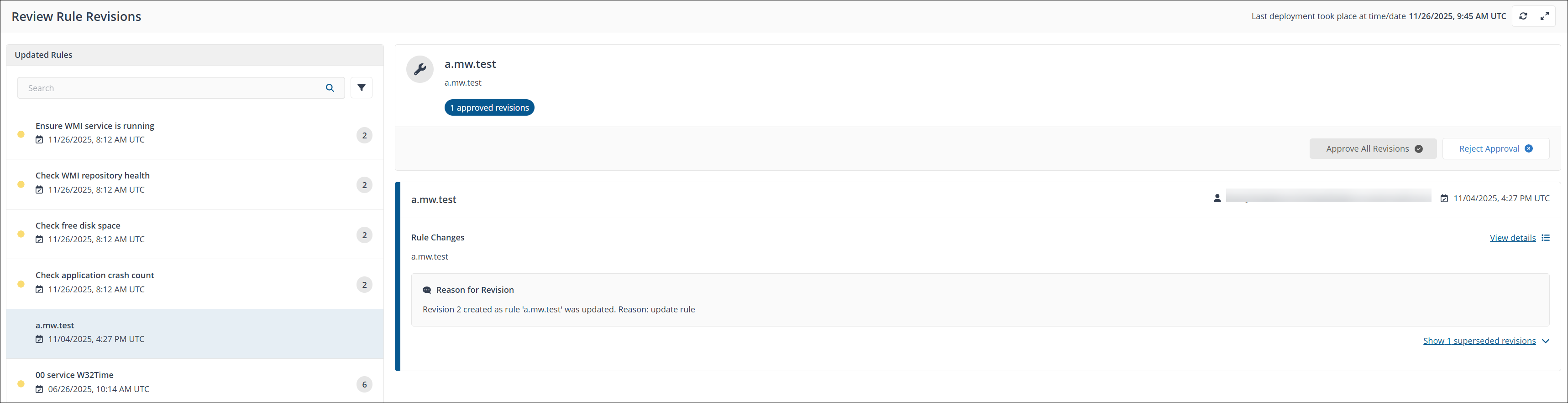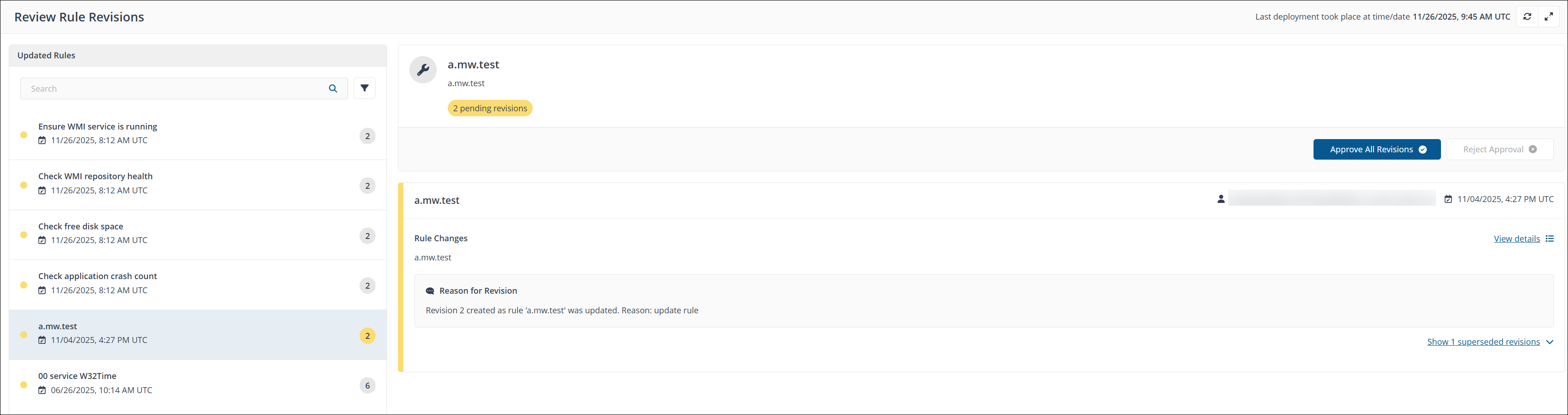 Revisions are in either Approved, Superseded, or Pending states, you can either Approve All Revisions or Reject Approval each rule revision.