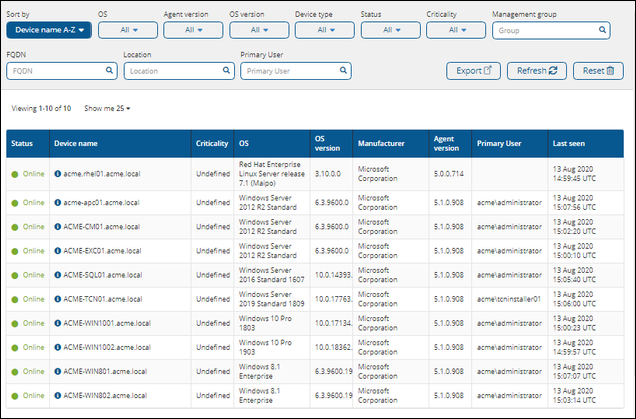 The picture shows the devices that have connected to our example 1E system. They are all shown as currently online.