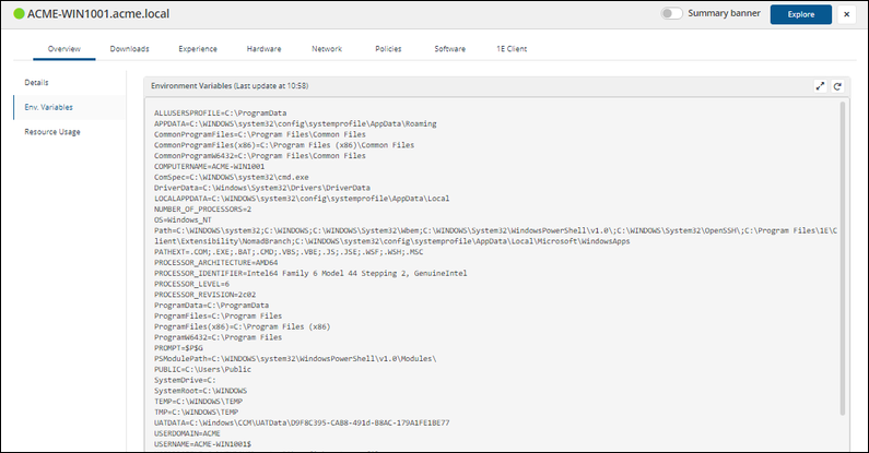 You can use the Devices section to browse a predetermined set of information for all the devices that are known to 1E, that is the devices that are currently connected to 1E or have connected in the past. This is in addition to the ability to explore devices using instructions to get back a range of information that is only limited by the instructions you have available to you.