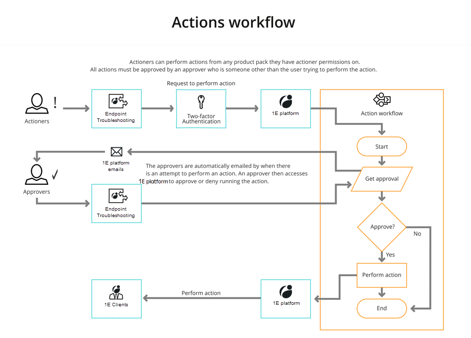 1E is a powerful tool that enables changes to be made across an organization's entire estate. It employs RBAC to ensure that only users with the required permissions can run particular actions. In addition, at the point of running an action, 1E uses two-factor authentication to ensure that the logged-on user is actually the user with the correct permissions.