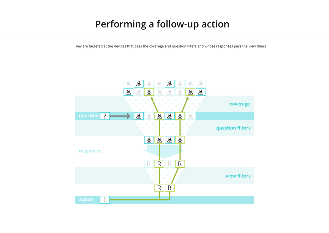 To run any action in 1E, you first need to ask a question. Questions may have coverage and question filters applied that restrict the number of devices that send responses. When the responses come back you can then optionally apply a view filter to reduce the responses even further. When you select a follow-up action, this will then be performed only on the final set of filtered responses.
