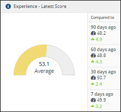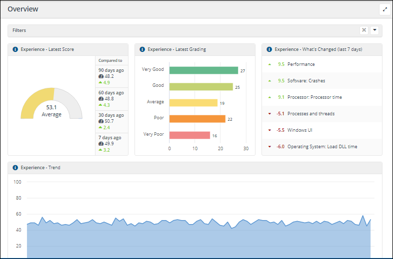 Your key indicator is the Experience - Latest Score chart, which gives your enterprise a score out of 100 based on a combination of measured events and user surveys. The closer you are to 100 the better the IT experience your end-users are having.