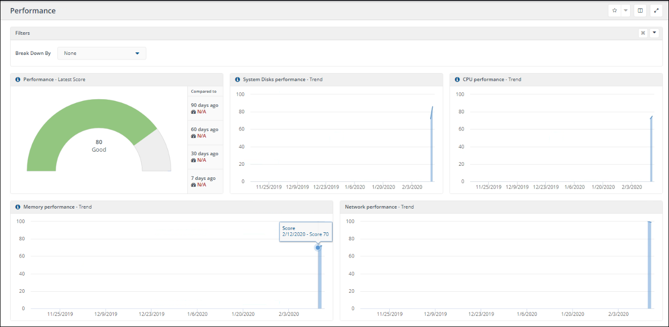 Without filters, the dashboard shows the status of all devices in the environment and all of their subsequent scores. When filters are added, the dashboard is recalculated according to the applied filter. Refer to Filters.