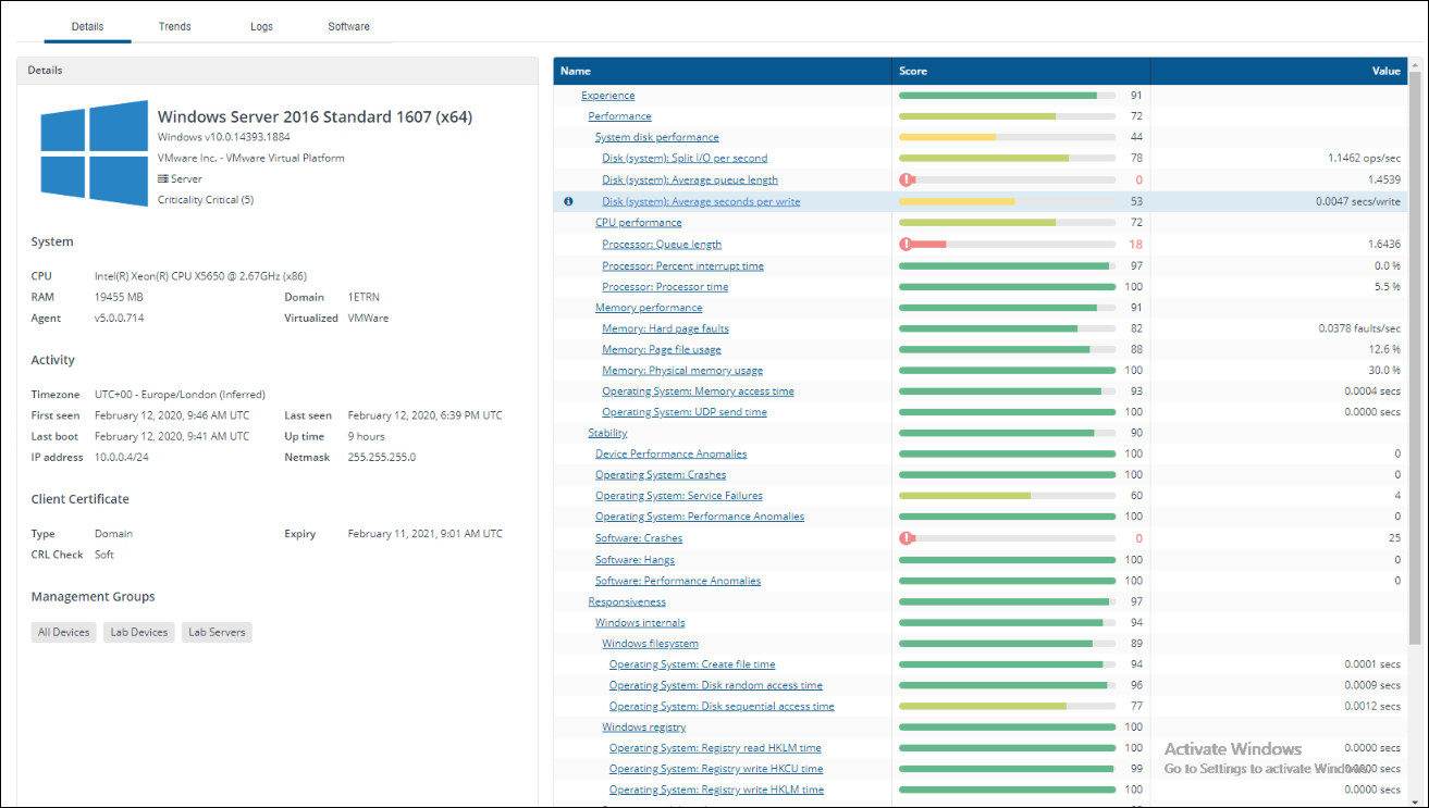 The Grading tile allows you to see the numbers of devices for each score. You can drill into each of the ratings - Very Good, Good, Average, and Poor to see the devices that have that score. This allows identification of the poorly performing devices very quickly.