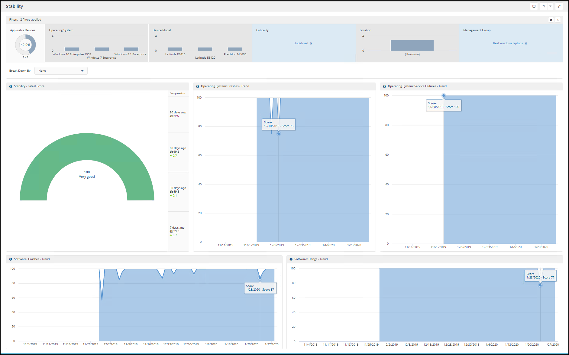 An application crash is annoying but the crash of the entire operating system could cause data loss so has more weight on the score. The page allows you to drill into the tiles to see the different metrics that are collected. For information on the makeup of the score see Stability score