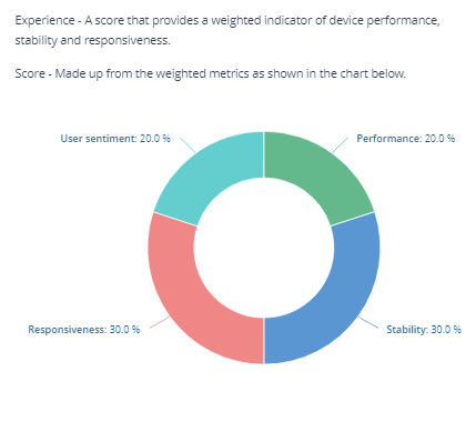 The User Experience score provides an indicator of device performance, stability and responsiveness. It is derived from weighted User sentiment, Performance, Stability and Responsiveness scores.