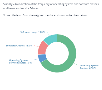 The Stability score is derived from four scores based on the number of crashes and hangs for software and for the Operating System itself.