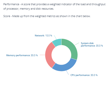 For example, Performance score is calculated by applying weightings to three other scores - System disk performance, CPU performance and Memory performance. The weightings are determined by the impact to end user experience for that item. Things that impact the user greater are weighted higher.