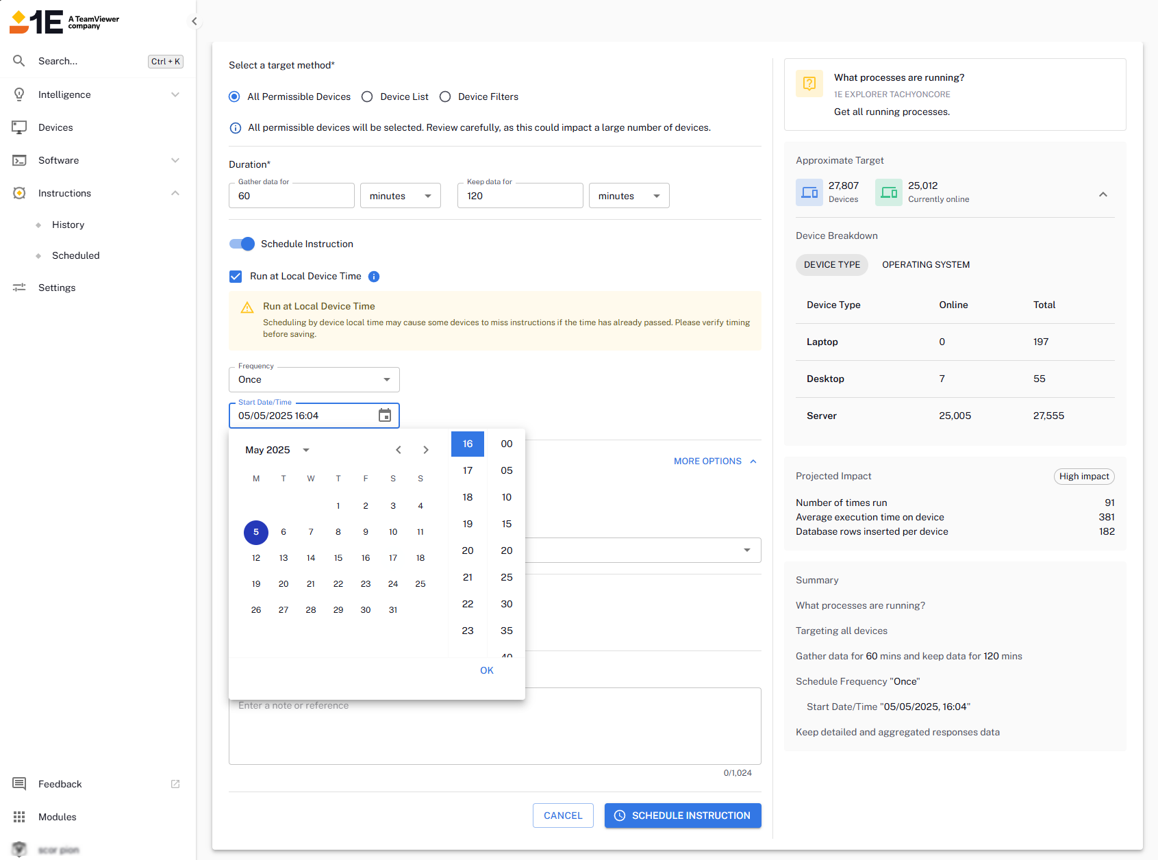 Scheduling instructions: Users can now schedule instructions in the new UI. After searching for an instruction, users can select it and configure scheduling options, such as run frequency, start time, and whether to align execution with local device time. All scheduled instructions can be reviewed on the new Scheduled page, accessible from the left-hand navigation bar. Refer to Home page, questions, and responses.