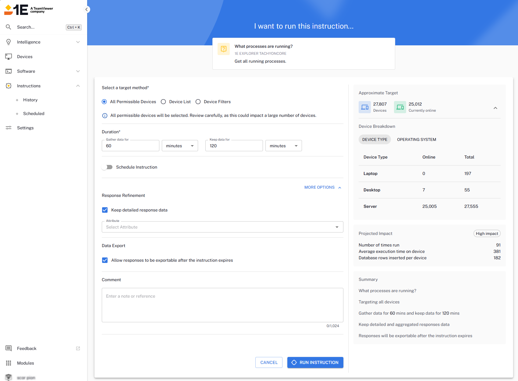 Full-screen instruction configuration: Previously, we added a new method of quickly running instructions from device pillars and device lists in the new UI. In this release, we’re augmenting this with a new full-screen experience for more advanced configuration, including scheduling, and altering coverage. This new interface is accessible by first searching for an instruction in the UI and provides every configuration option available in the existing Endpoint Troubleshooting app.