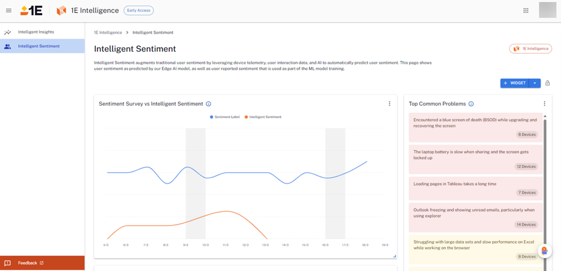 Intelligent Sentiment augments traditional sentiment methods such as surveys by providing an automatically generated user sentiment based on Edge AI analysis of device and user interaction telemetry. This provides improved situational awareness of the sentiment across your entire user base, along with improved abilities to understand why sentiment might be degrading.