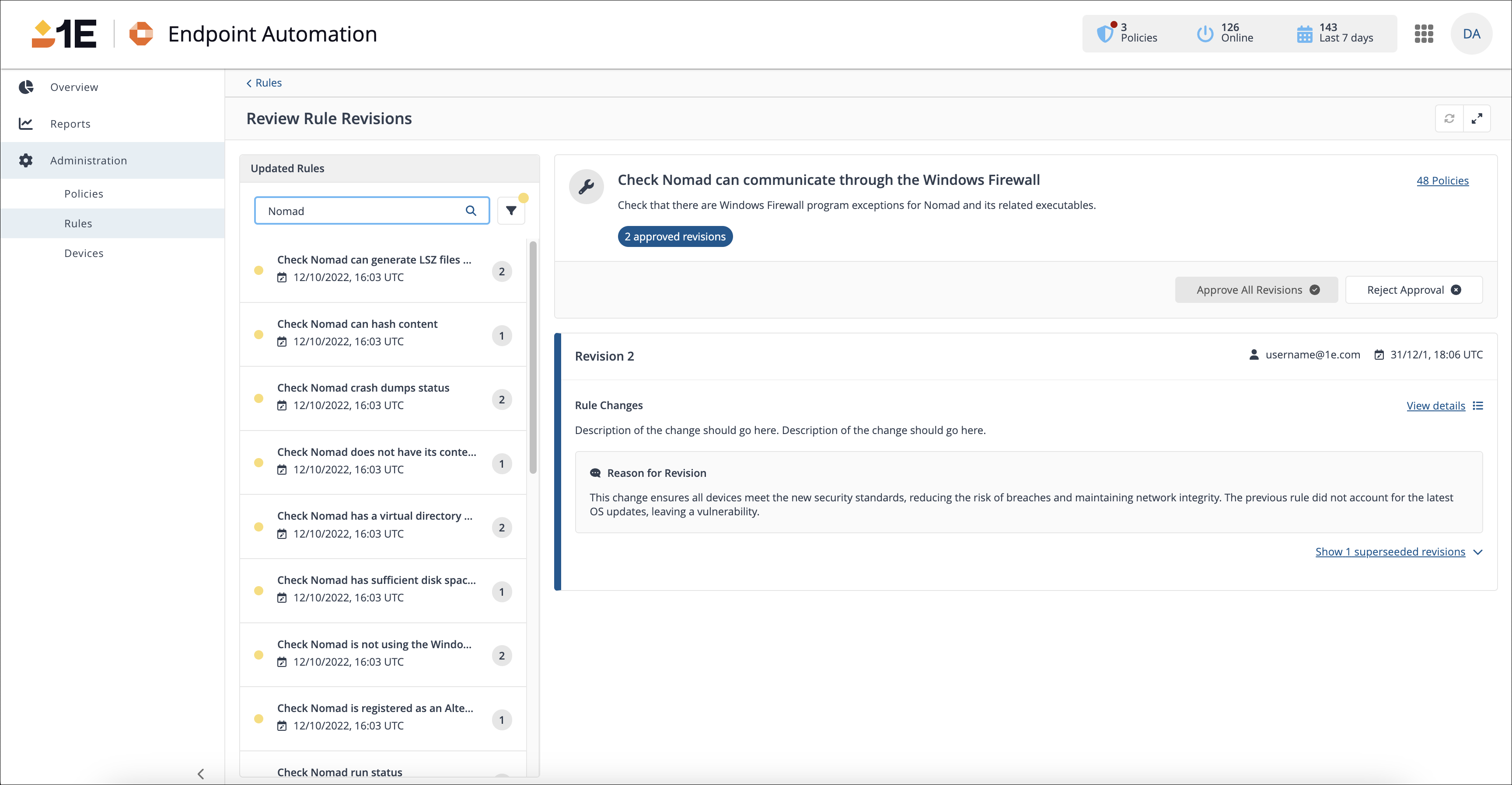 This next iteration of operational safeguards within the 1E Platform introduces Rule Approval. Rule Approval focuses on visibility and the impact of rule revisions within 1E Endpoint Automation. By having a clear understanding of the impact of change, admins are able to make a well-informed decision on whether they would like to either approve or reject the request. Refer to Rule revision and approval.