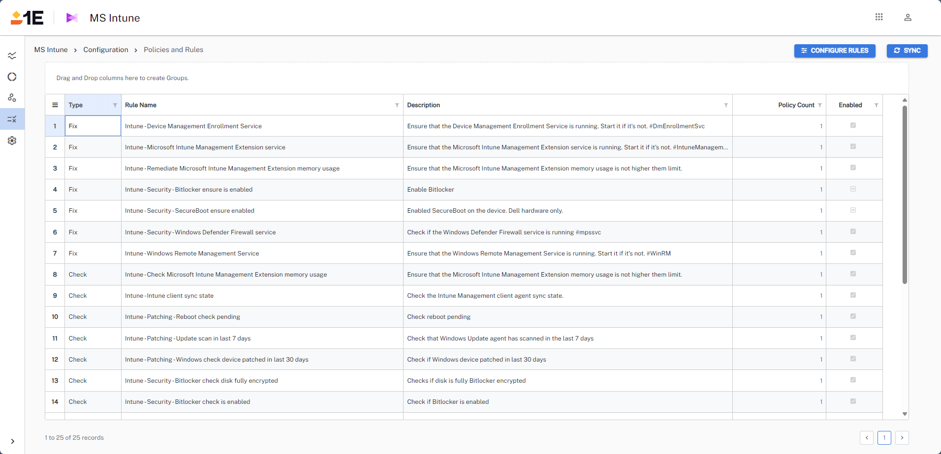 - View of All policies and all Rules enabled in 1E Platform.