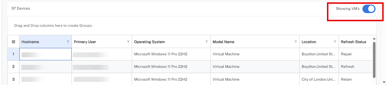 - We have added a new toggle to show/hide VMs on the Device Refresh dashboard.