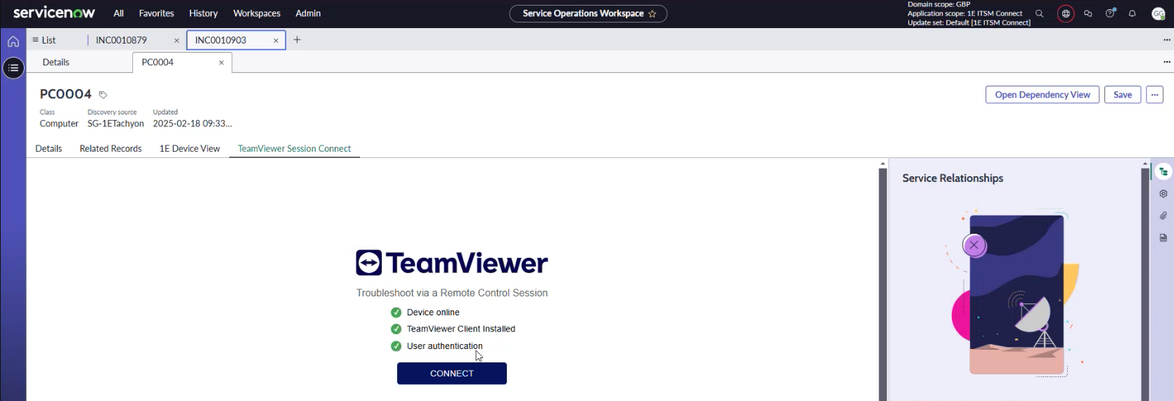 Remote connect to a device with TeamViewer, direct from Service Operations Workspace (SOW): Users now have the ability to utilize a new feature on the SOW device tab called TeamViewer Session Connect, which allows for a seamless connection to a device using the TeamViewer integration.