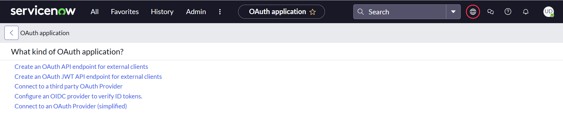 - Navigate to System OAuth > Application Registry and click New to create a new record. From the available list of OAuth application, select the option Create an OAuth API endpoint external clients.