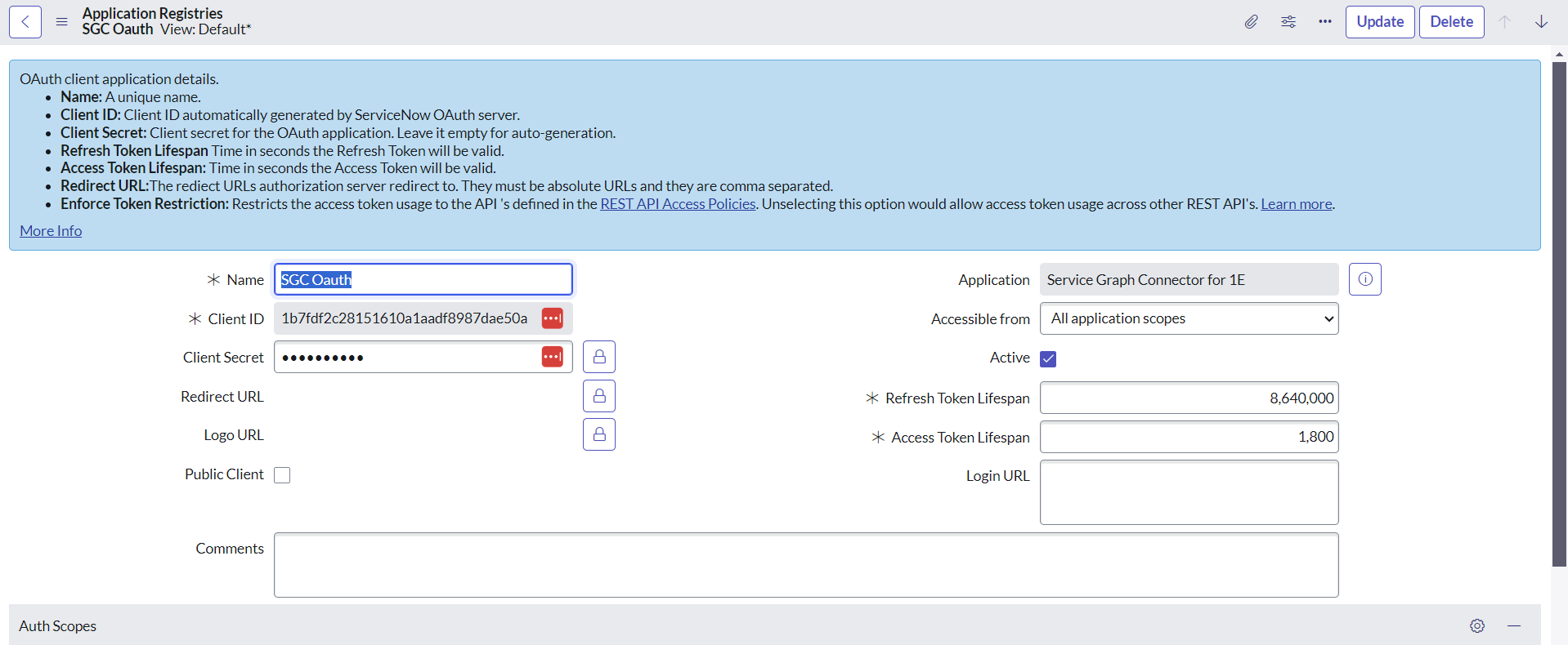 - Create an application registry record when connecting with OAuth. Ensure that you are making these changes in the application scope of Service Graph Connector for 1E.