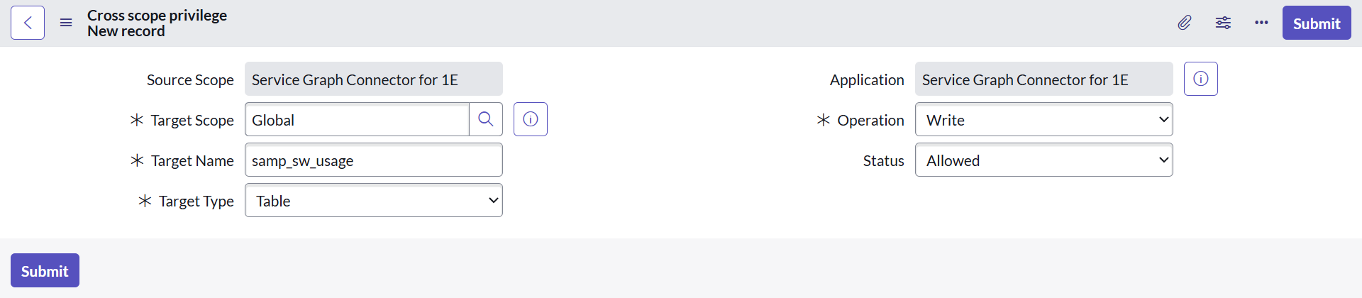 Verify your cross-scope privilege access and check if you have write permission for the samp_sw_usage table. If you do not have cross-scope privilege access, create a new one as described below: