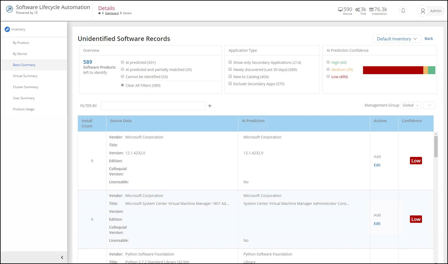 AI predicted and partially matched: Where the vendor or title was identified through previous knowledge from the 1E Catalog, these records have a default high confidence score