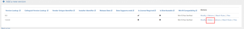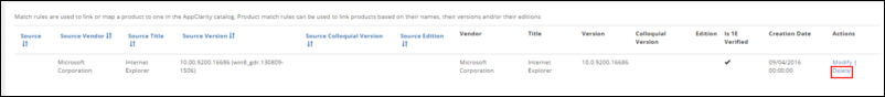 You can only delete products, versions, or editions you created. New product items added by the 1E curation team are marked as 1E Verified and cannot be deleted.
