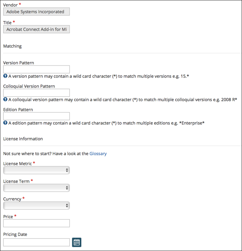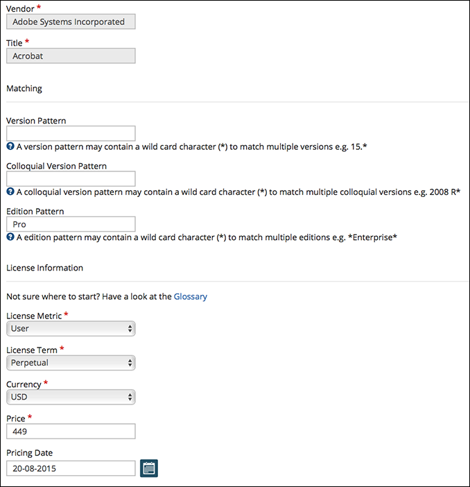 Licensing rules define how a product or a specific version of a product is licensed, for example, what metric they use or the average price of the license. You can set up different license rules for specific versions by using version patterns, for example, 10.*.* has license metric = Device; 11.* is licensed by User.