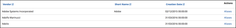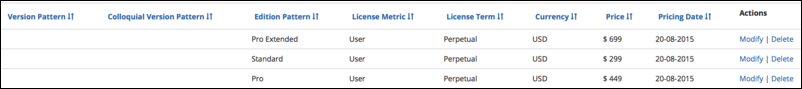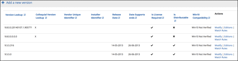 To view a software product's versions, click the Version link to the right of the product screen to show a list of versions for that product, refer to Using filters.