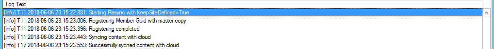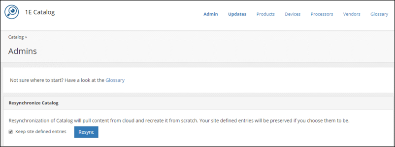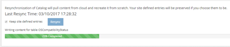 Starting Resync with keepSiteDefined=True indicates that a 1E Cloud Catalog synchronization has started and the connection to the Catalog Update service has been successful.