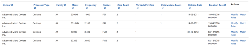 List of Catalog processors - click Modify to update the details of a processor or click Managing match rules to edit an existing rule or associate a new rule with it.