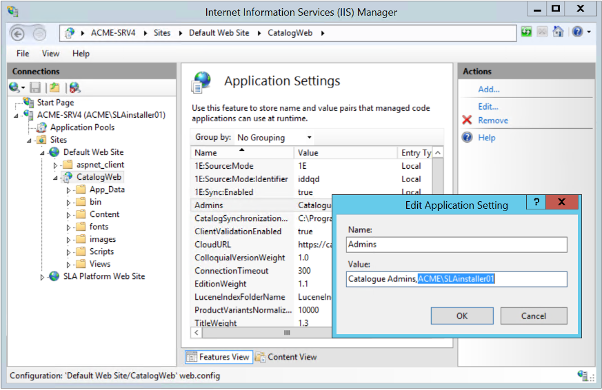 Copy<add key="Admins" value="Catalog Curators, ACME\SLAinstaller01" /> -