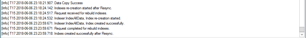 Data Copy Success and Indxes created successfully after Resync, these indicate the data synchronization with the cloud is a success and the indexes have been rebuilt, this means the catalog is now up-to-date and ready to use.