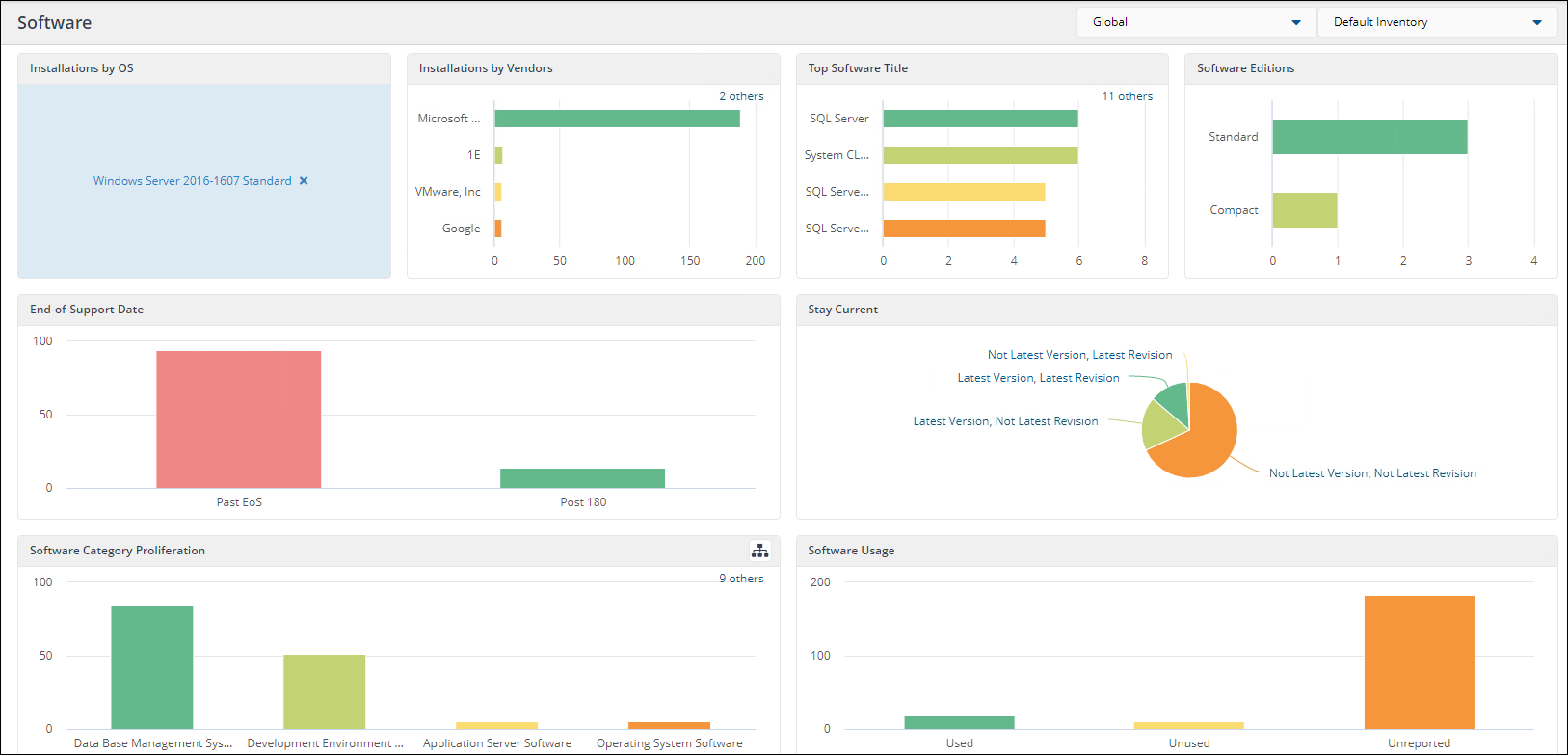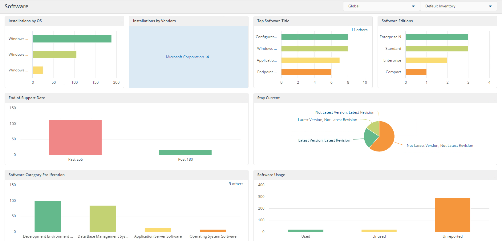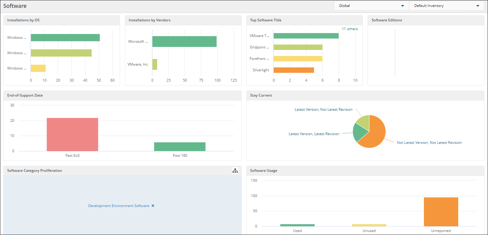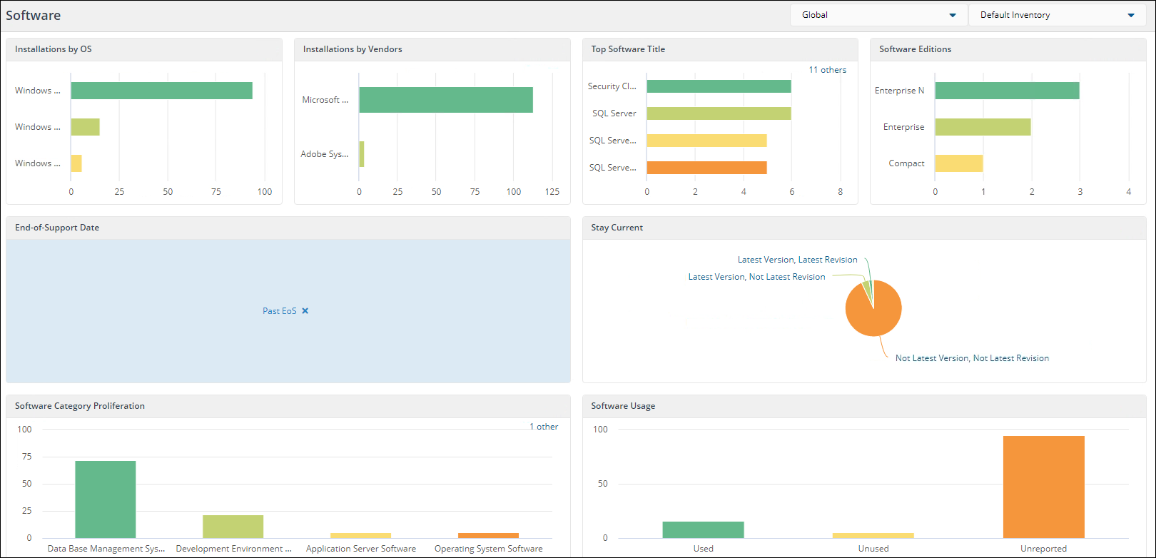 Software Inventory shows data captured from sources such as Configuration Manager, Big Fix and vCenter if you have them configured. The dashboard is refreshed (recalculated) when the page is opened or the page is refreshed in the browser.
