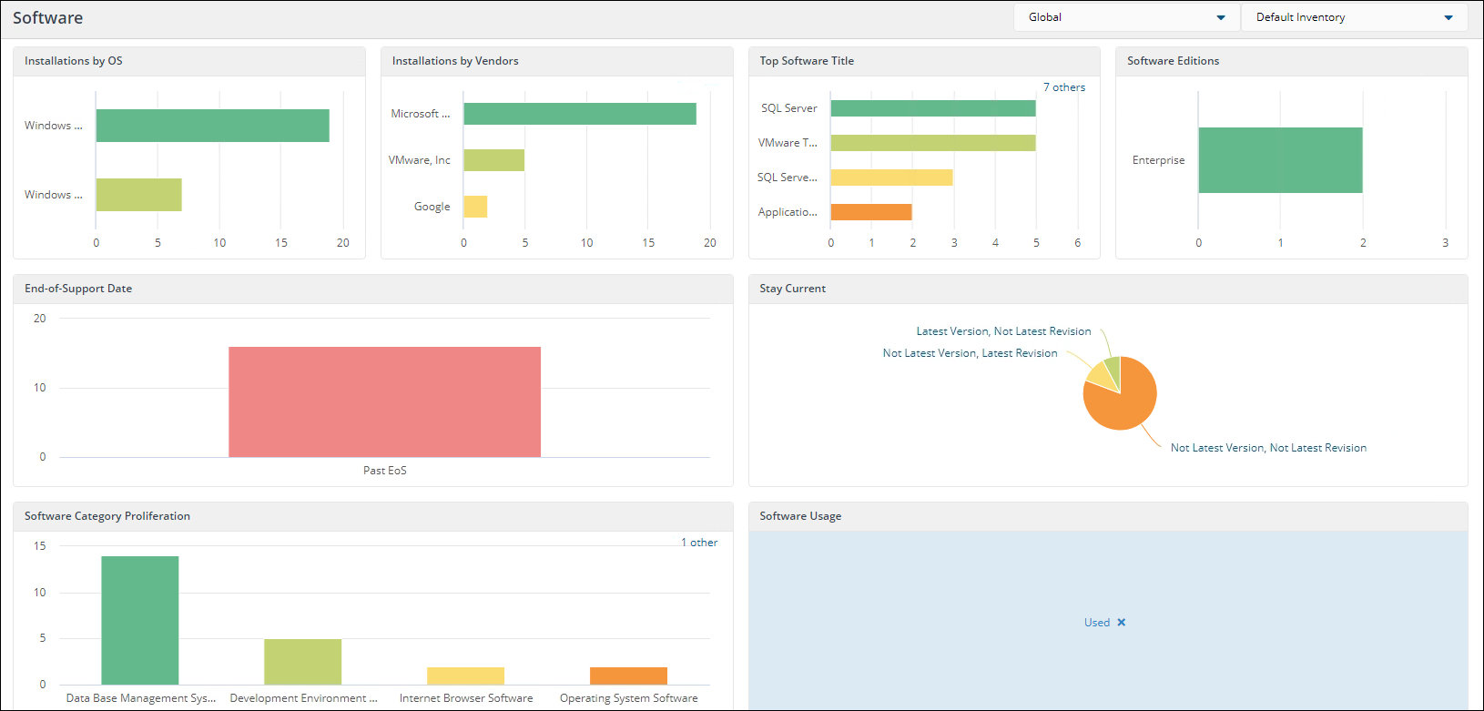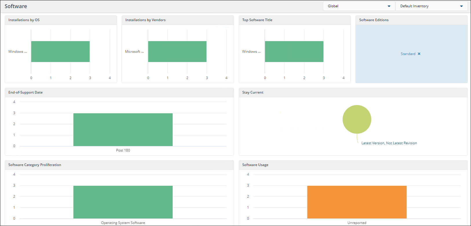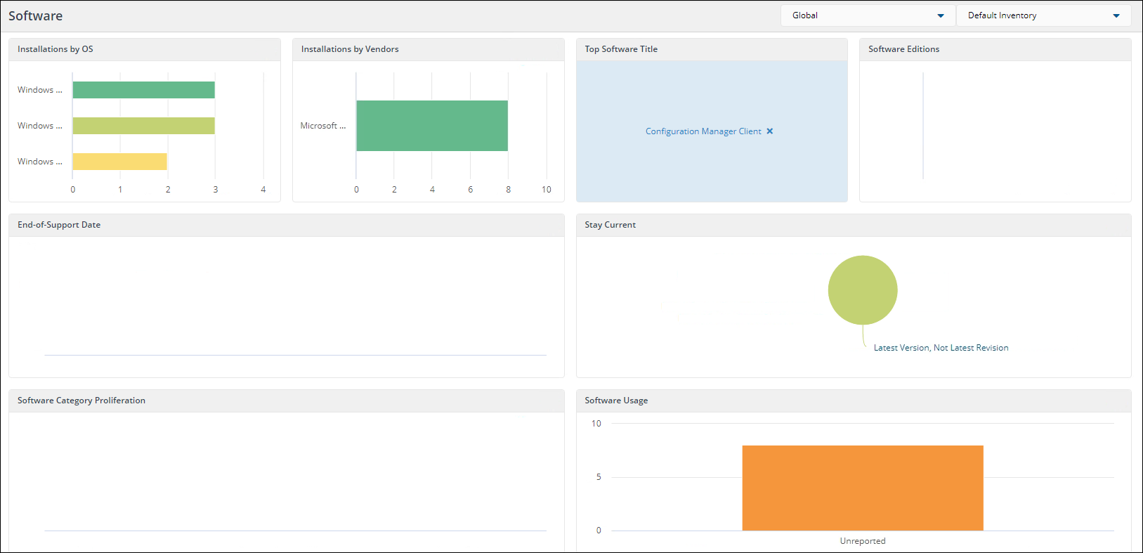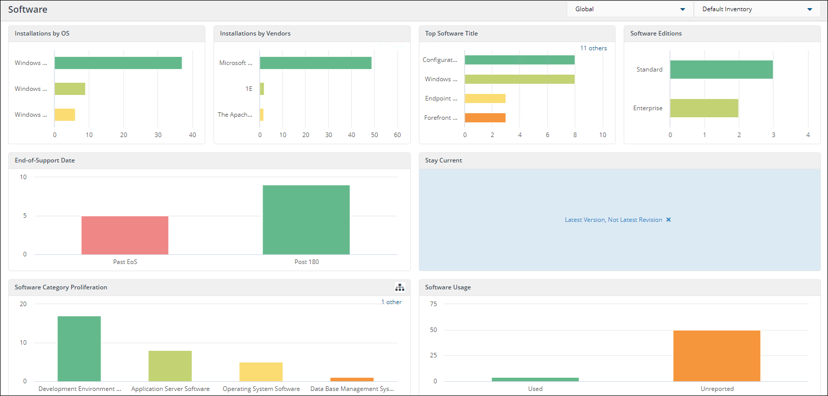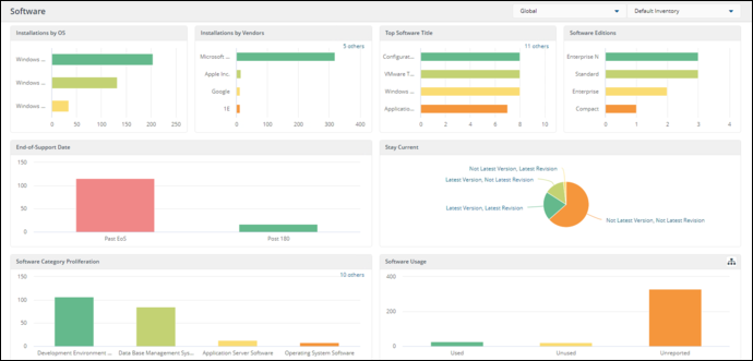 Software Inventory shows data captured from sources such as Configuration Manager, Big Fix and vCenter if you have them configured. The dashboard is refreshed (recalculated) when the page is opened or the page is refreshed in the browser.