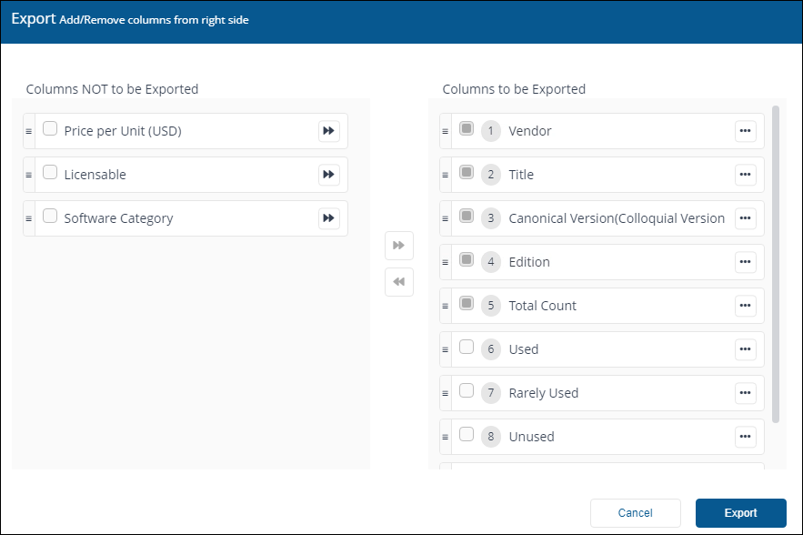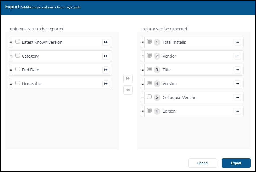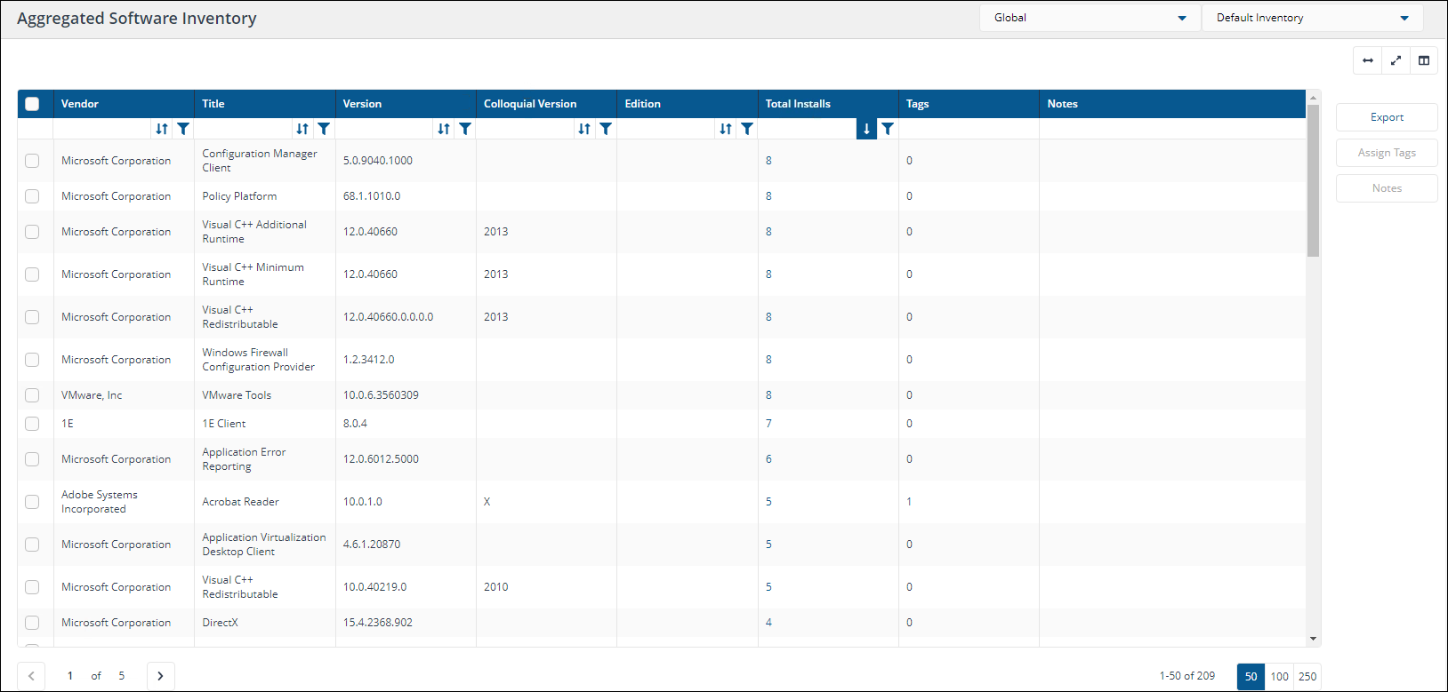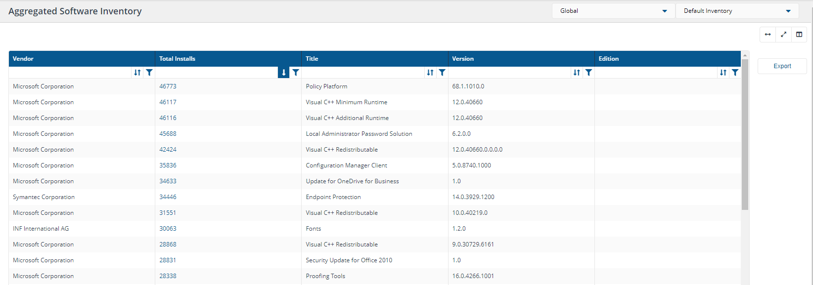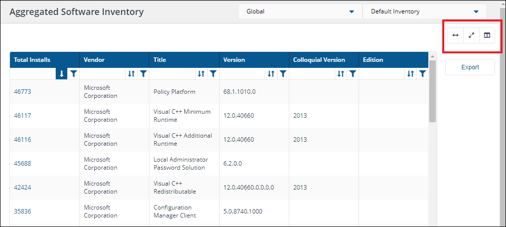 The following table shows the available Aggregated Software Inventory columns, not all columns are displayed by default. You can add other columns or remove them using the column chooser control.