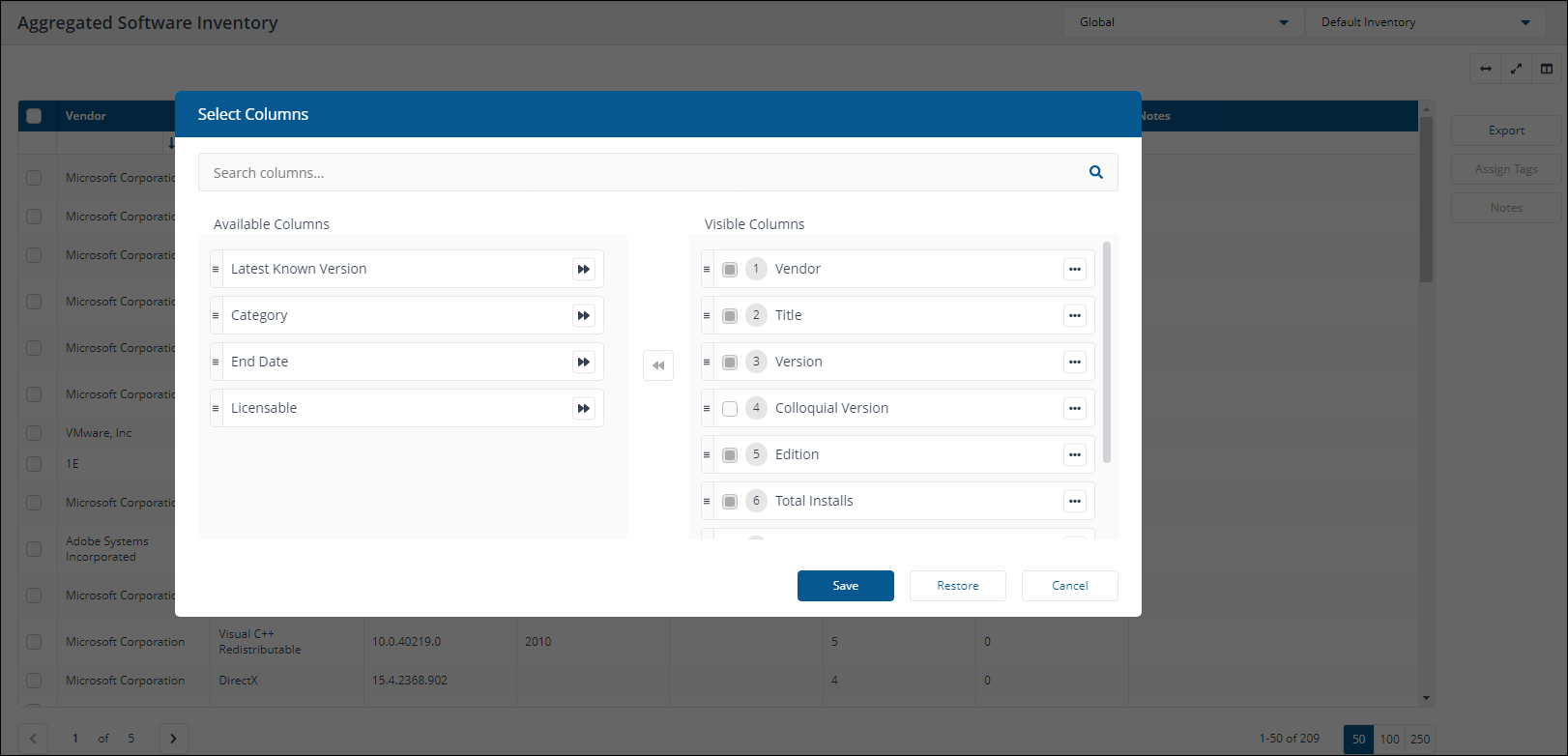 For example, in Inventory > Aggregated Software Inventory we use the Choose columns control to pick which columns are displayed.
