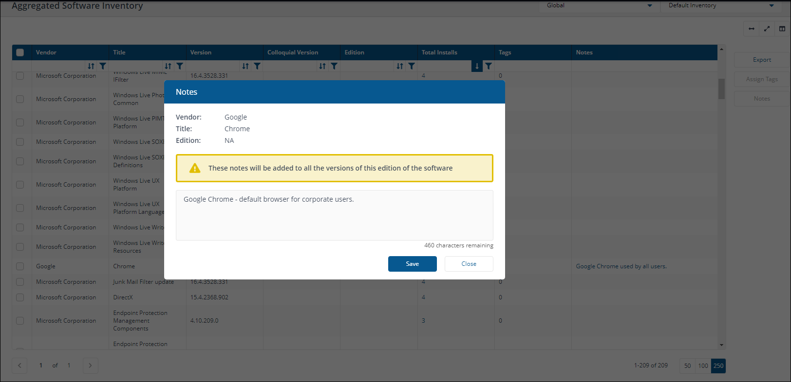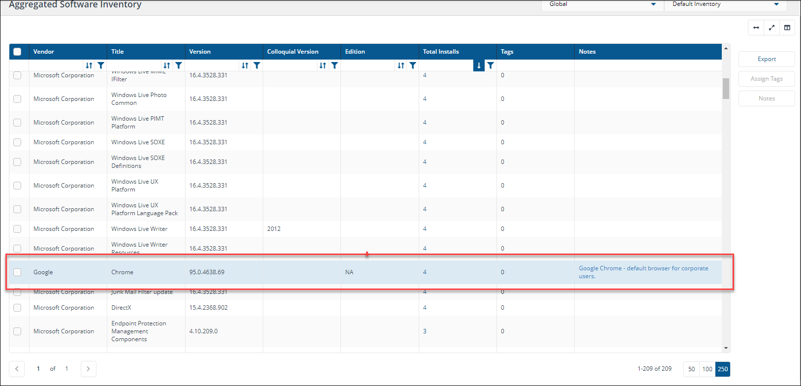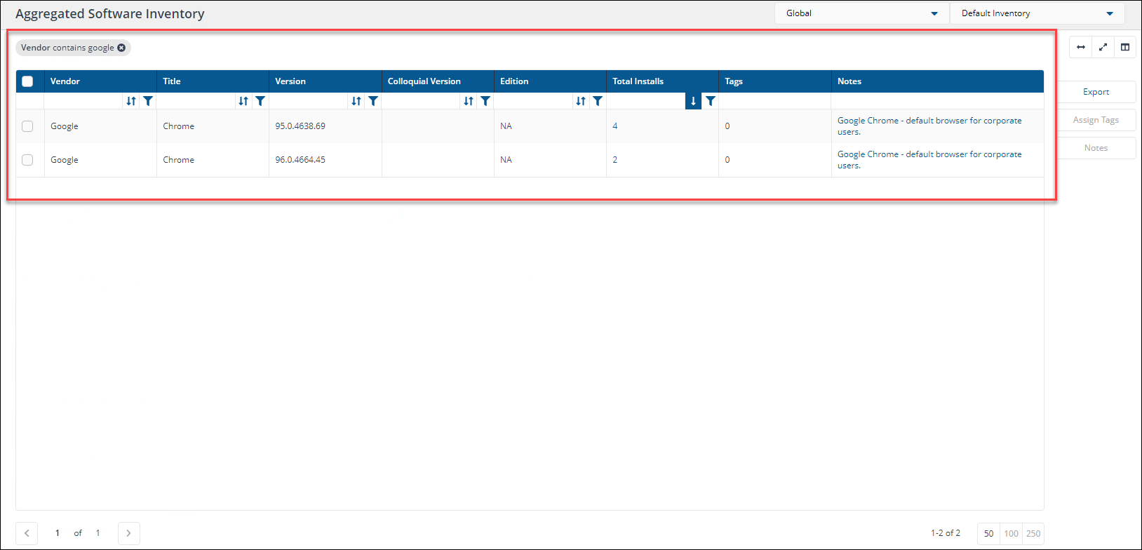But as the note applies to all versions of Google Chrome when we filter Aggregated Software Inventory by Vendor contains google, we can see that our note was also applied to Google Chrome v95.0.4664.45.