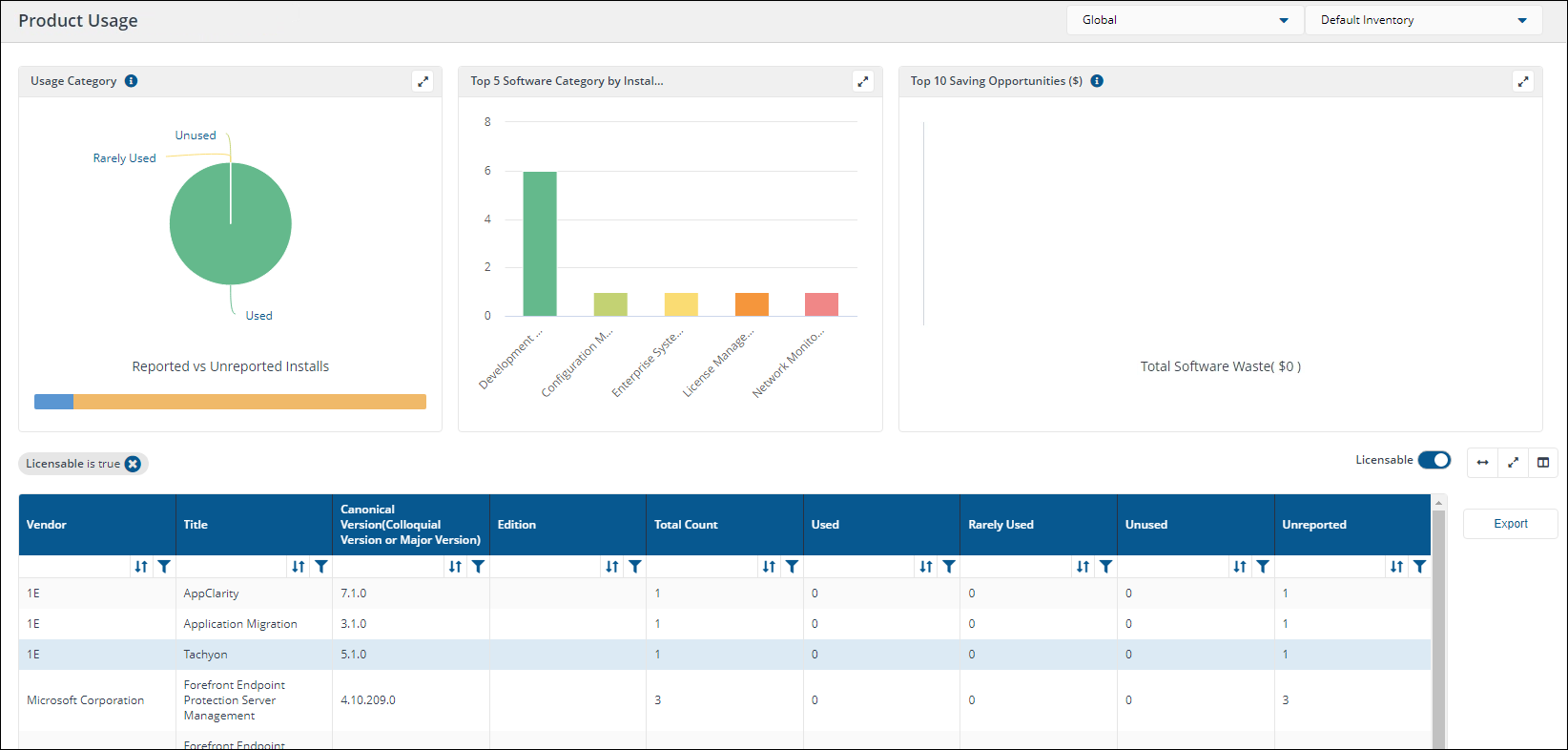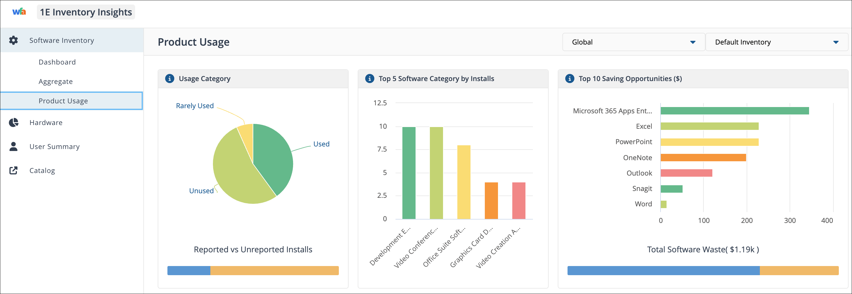The Product Usage page shows the distribution of software installs, the top five categories by install and top saving opportunities across your software estate.