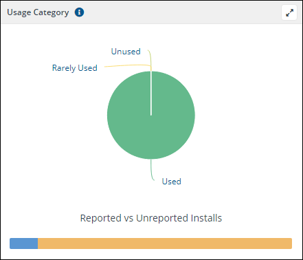 The pie chart shows the distribution of installs Used, Rarely used, and Unused as a percentage of total installs that report usage (i.e. Total Reported Installs). The bar at the bottom shows the distribution of installs as Reported and Unreported as a percentage of Total Installs.