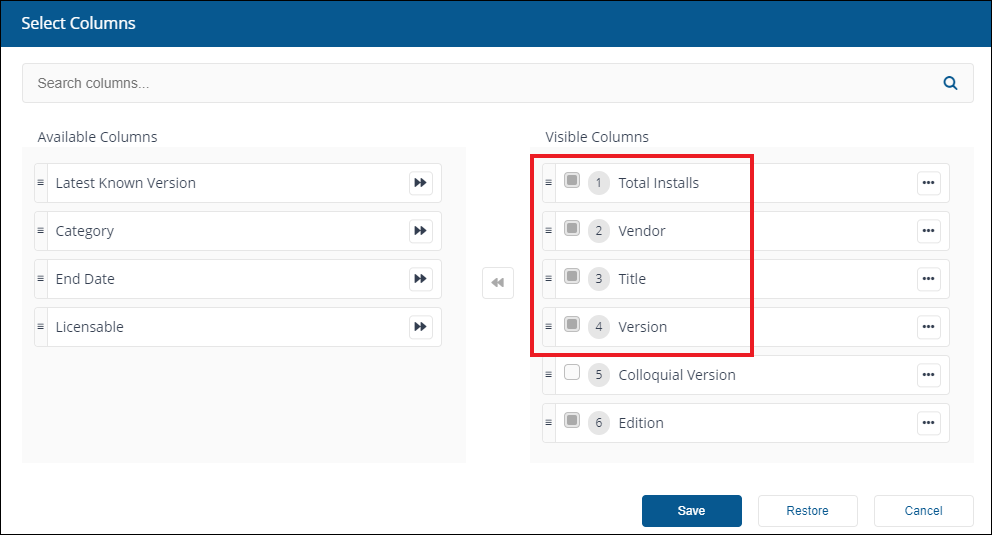 You can also choose Restore to reset the column chooser or Cancel to cancel your changes and exit the Choose columns control.